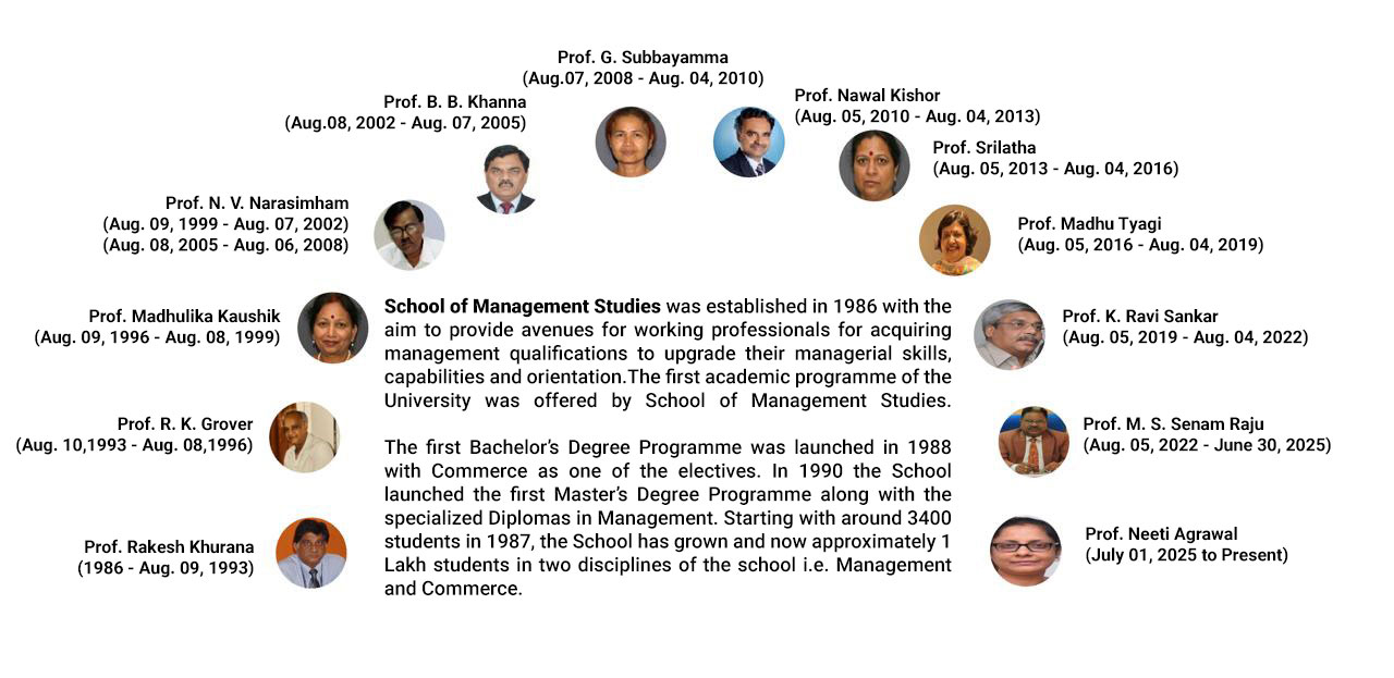 I am pleased to extend a warm welcome to all our learners, faculty, alumni, and stakeholders. Since its establishment in 1986, the School of Management Studies has consistently led the way in delivering exceptional management education through Open and Distance Learning (ODL) and has now expanded its offerings to include online mode as well. Our prestigious programmes have set a benchmark in India, continually empowering thousands of professionals and entrepreneurs annually.